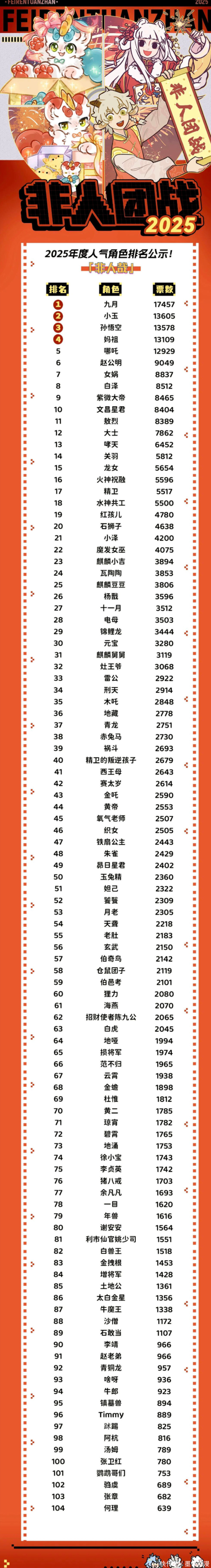 《非人哉》官方公布的2025年度人气排行中,公布了一百多个角色的排名情况,其中九月以17457票获得第一,超过第二的小玉三千多票。孙悟空排名第三,妈祖排名第四,哪吒排名第五。至于敖烈融期策略,那是排名到了第十一。最末尾的是何理,排名第104。